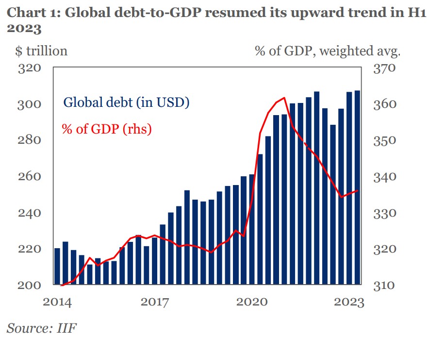 国际金融协会(IIF)发布《全球债务监测》报告显示,在 2023 年上半年,全球主权债务、企业债务和家庭债务总额增加了 10 万亿美元,达到创纪录约 307 万亿美元。