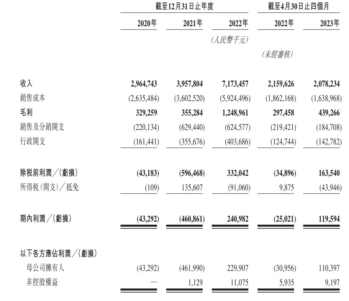 财务方面,于 2020 年、2021 年、2022 年、2023 年截至 4 月 30 日止四个月,该公司分别实现收入人民币 29.65 亿元、39.58 亿元、71.73 亿元、20.78 亿元;同期分别实现亏损人民币 4329.2 万元、亏损 4.61 亿元、利润 2.41 亿元、利润 1.20 亿元。