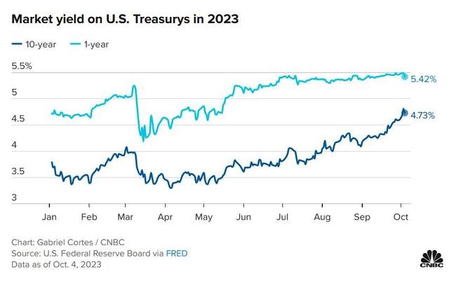 随着长期国债利率飙升,上述投资正在成为市场投资者的一种主流应对方式。过去几周,10 年期国债收益率以惊人的速度飙升。上周五非农数据超预期之后,10 年期国债收益率跃升至 4.89%,创十六年最高水平。