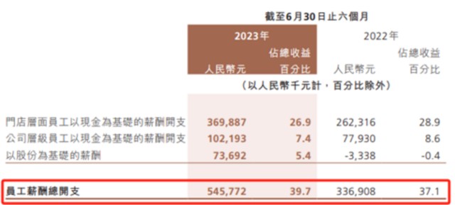 并且随着门店数量的扩张以及销售订单的增加,员工薪酬开支仍在上升。根据达势股份最新半年报披露,2023 年上半年员工勤酬开支占总收益的 39.7%,比去年同期上升 2.6 个百分点。