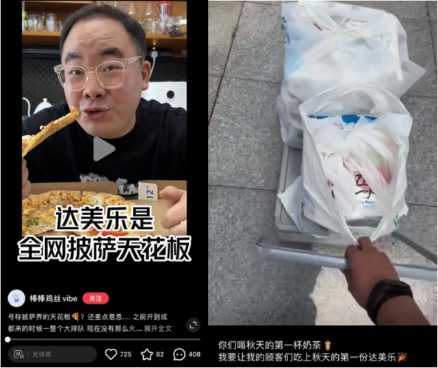 达美乐披萨近期越来越频繁出现在小红书、抖音等种草平台,不仅引来各路网红大 V 们纷纷测评披萨口味,甚至还催生出了跨省代购生意。