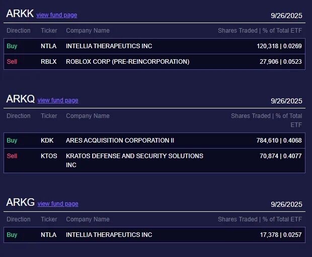 NTLA: Bought 120,318 shares in ARKK, accounting for 0.0269%; bought 17,378 shares in ARKG, accounting for 0.0257%.