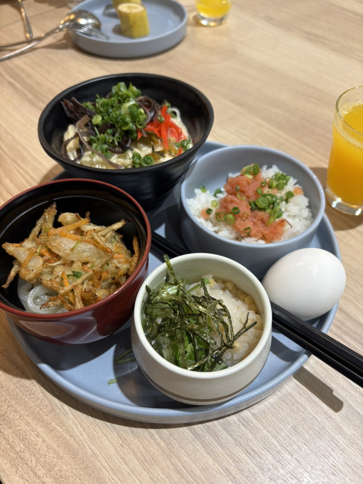 The last breakfast of the journey was a traditional starchy meal: ramen, udon, ochazuke, and white rice. After this breakfast, I was full of energy in the morning, but even two hours of exercise probably wouldn't fully consume it.