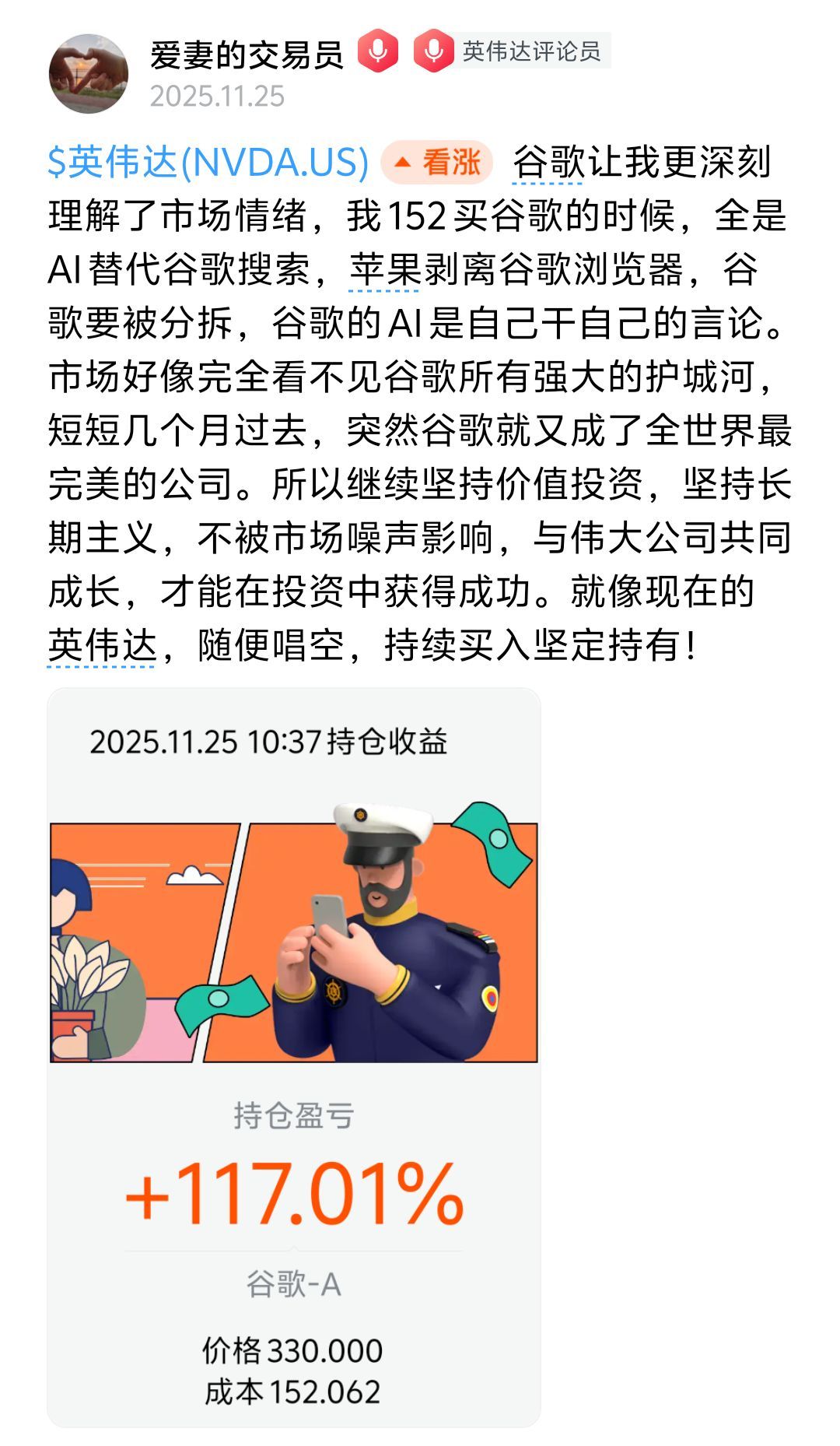 接着没过几个月,叙事反转了,突然谷歌 TPU 都能颠覆英伟达了,Gemini 秒杀 Chatgpt 了,巴菲特也建仓了,股价一路高歌猛进,半年翻了一倍,大家开始讨论,谷歌和英伟达谁能率先达到 10 万亿,甚至认为在这场市值竞赛中,谷歌会赢过英伟达。我记得当时也发了个贴。