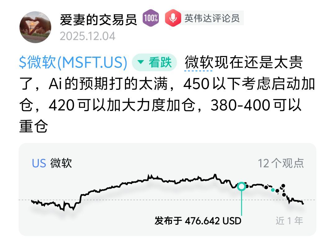 微软在 500 美元附近的时候,我发过帖子,核心观点是:当时市场对微软的 AI 预期打得太满,估值偏贵,大概率会面临回调。转眼快四个月,微软已经跌到了我当时认为可以重点关注、甚至重仓评估的位置。先说这轮下跌到底是怎么来的?