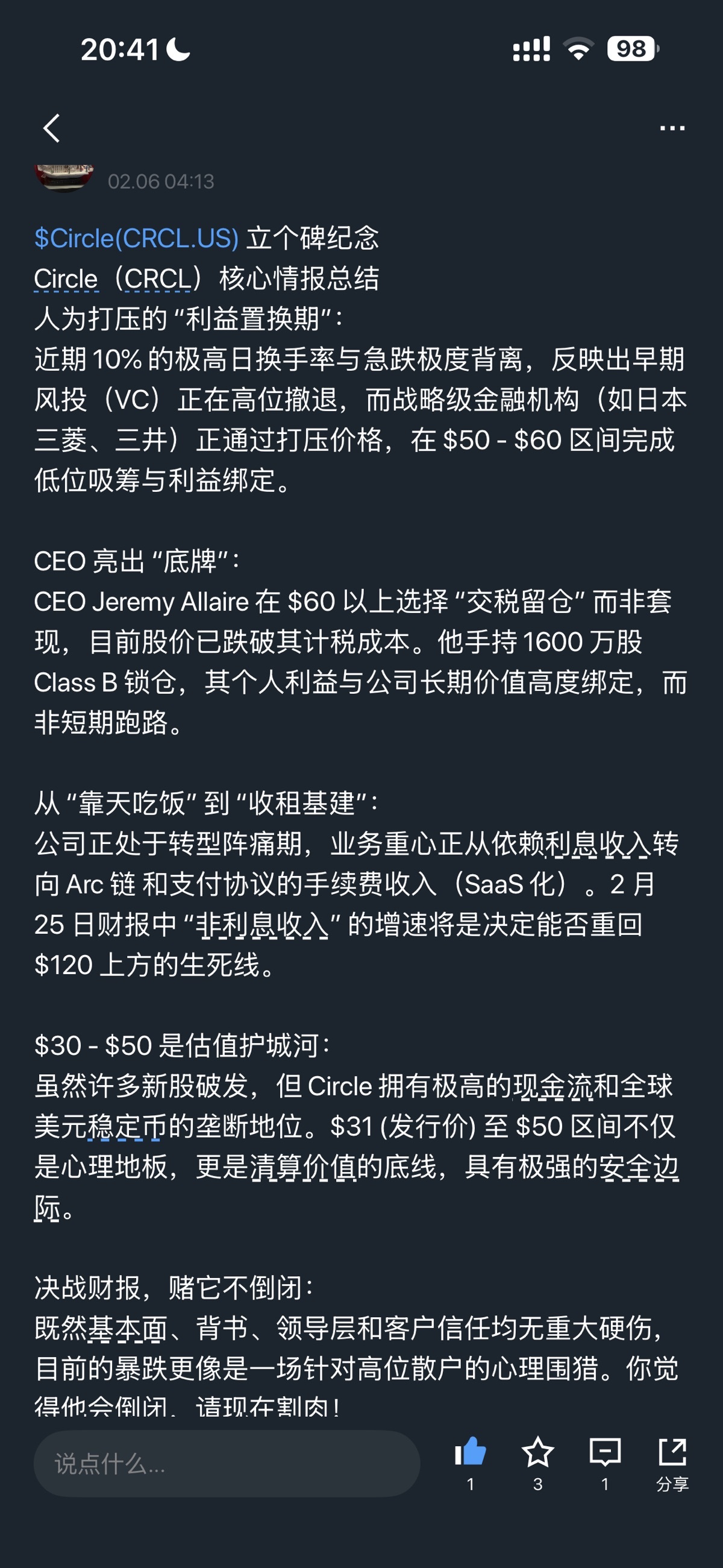 Traded ValueAbout crcl, I posted this at the most difficult time on February 6th