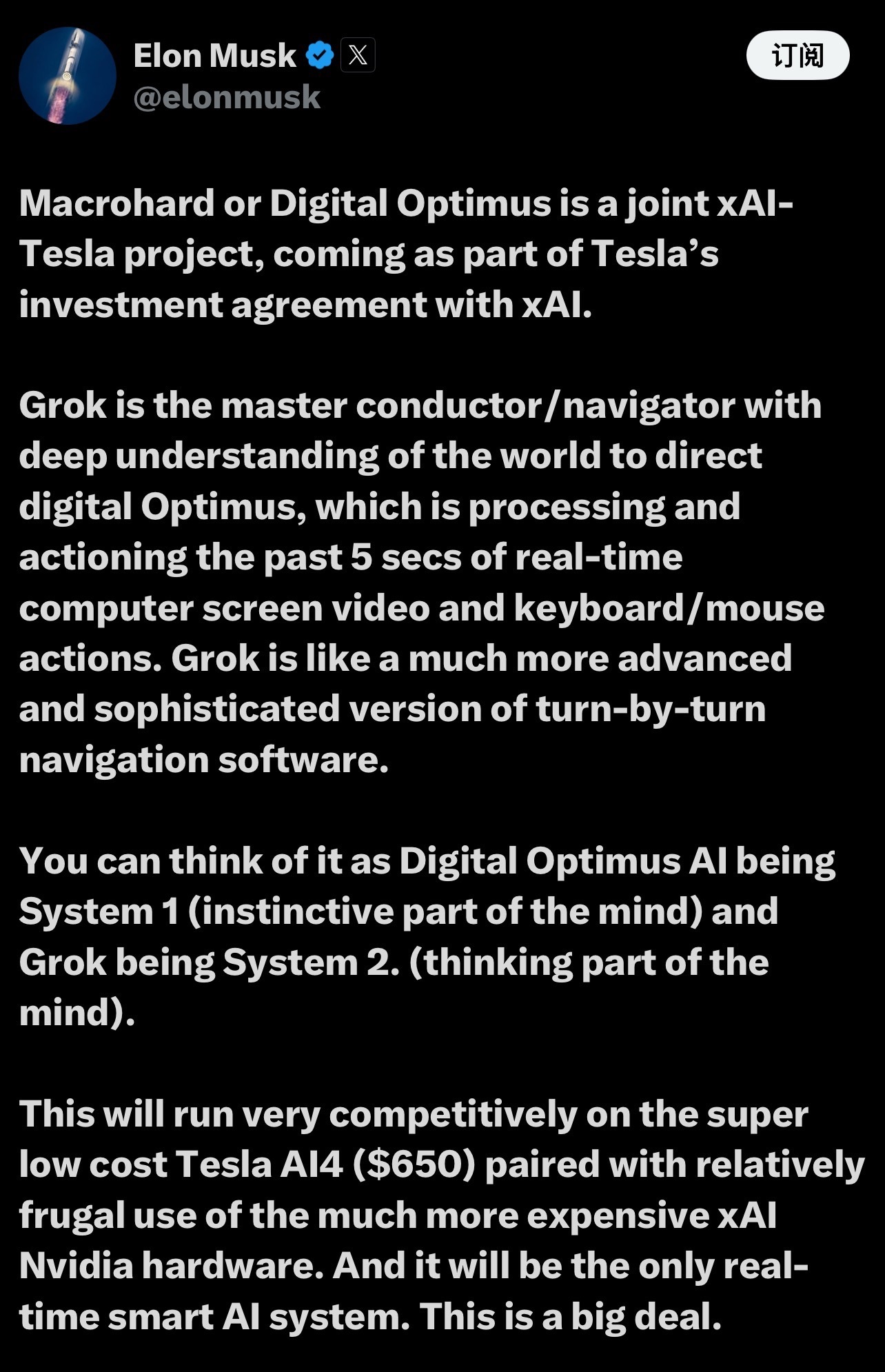 This is a joint AI system between $Tesla(TSLA.US) Tesla and xAI, and also part of Tesla's investment agreement with xAI.
