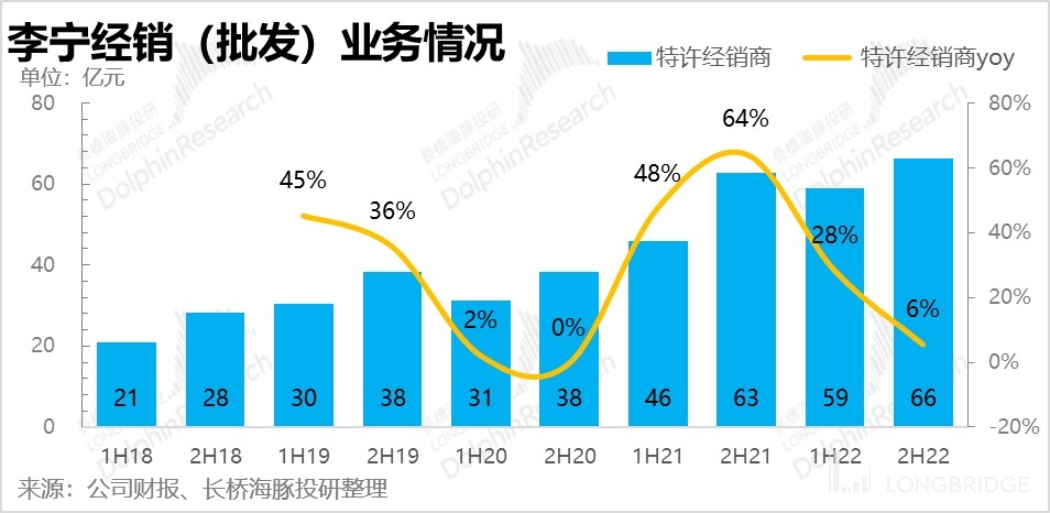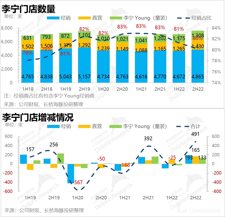 The highlight is that Li Ning continued to expand its channel with large stores as the core in the second half of last year, and the effect was very obvious. Both the number of distribution outlets and direct sales outlets increased beyond expectations. With the trend of being diverted from online to offline, after the adjustment of epidemic prevention policies, the passenger flow of offline stores has gradually recovered. At this time, channel expansion is definitely advantageous for the company's continuous market share growth. 3.2 Offline distribution resists the trend