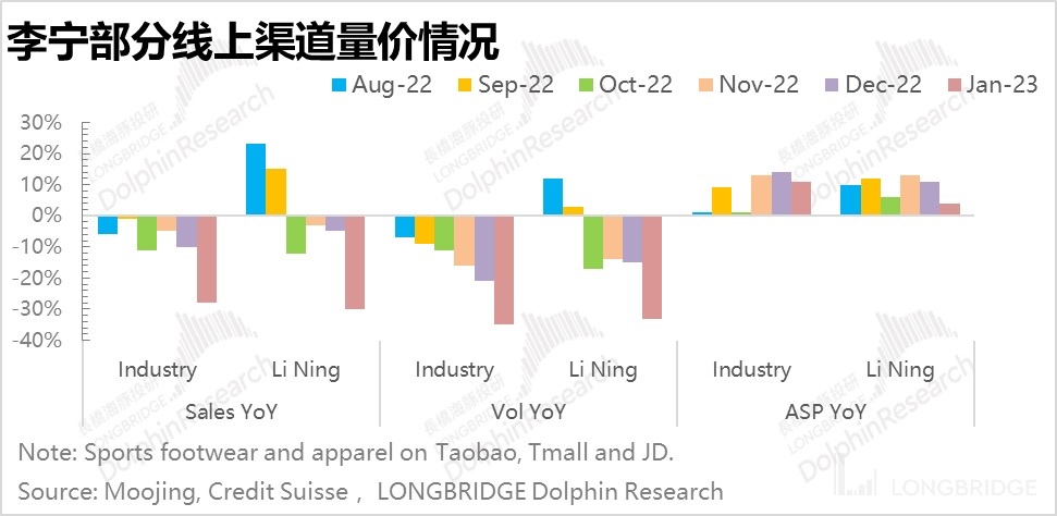 What is relatively difficult for Dolphin is that in the second half of last year, the ability to hold steady was basically dependent on the increase in ASP. Taking online sales as an example, most brands, including Li Ning, performed very poorly in terms of sales volume, especially in the fourth quarter of last year. However, the proportion of online sales is currently not high. Most brands are maintained at around 30%, and the main force is still offline. Moreover, there is a trend of continuous diversion from online to offline recently.