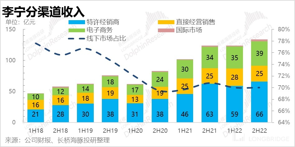 Next, let's take a look at Li Ning's channel performance. The company's main sales channels still rely on offline sales. Against the backdrop of the relentless attacks by e-commerce businesses, offline sales still account for 70%.