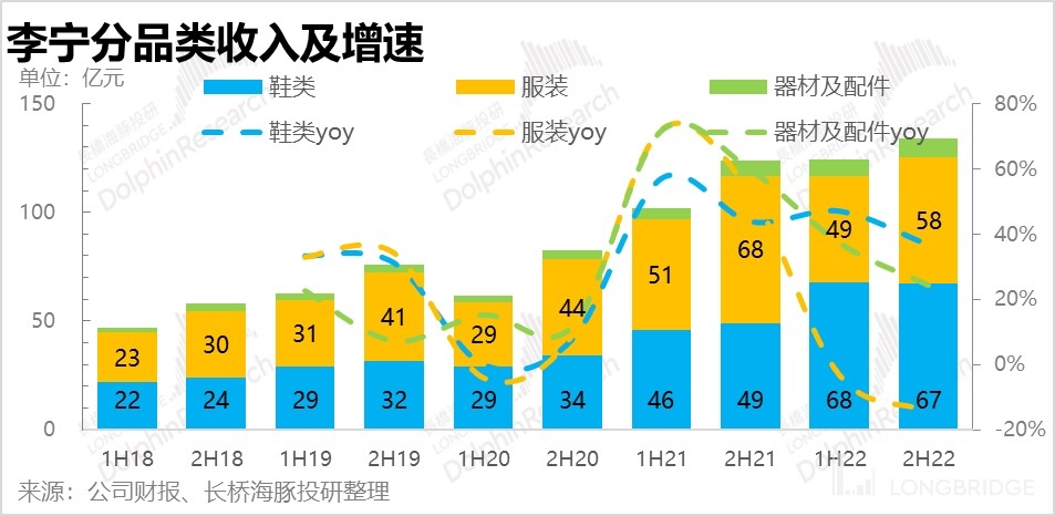 Li Ning's shoes still maintain a high growth trend (no wonder it is Li Ning's trump card). It is not easy to achieve such a growth rate. In fact, the base for shoe sales in the second half of the previous year was not low, and in the second half of last year, in addition to the interference of the epidemic, the traffic in December also decreased significantly due to adjustments in epidemic prevention policies. The decline in the clothing category performance is in line with the industry situation. However, due to the high base of Li Ning's clothing category operating income in the second half of 2021 (reaching 6.8 billion yuan, the highest in history), it has intensified the downward trend of Li Ning in this category in the second half of last year.