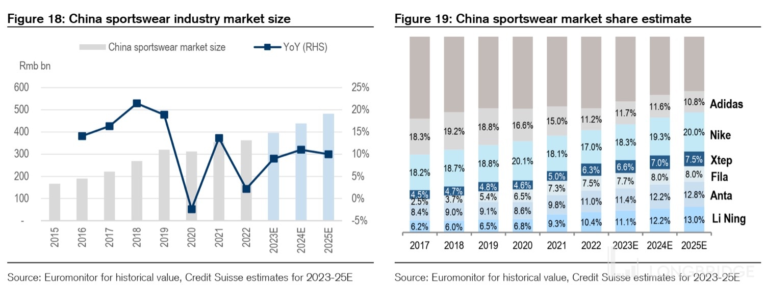 The improvement in the market share of domestic brands is due on the one hand to the continuous strengthening of the domestic product power, with brands such as Li Ning continuously improving the quality and design of their products that better fit the current consumer preference for Chinese-style fashion, which was also repeatedly mentioned in our previous in-depth report.