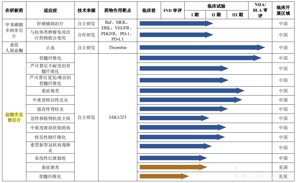 泽璟制药研发的 1 类新药盐酸杰克替尼片,是一种广谱激酶小分子抑制剂,能够抑制非受体酪氨酸 Janus 相关激酶 JAK1、JAK2、JAK3 和 TYK2,以及抑制 FLT-3 和 c-Kit。目前,盐酸杰克替尼片治疗中、高危骨髓纤维化适应症的 NDA 申请已于 2022 年 10 月获 NMPA 受理,这也是首个提交 NDA 的国产 JAK 抑制剂类创新药物。