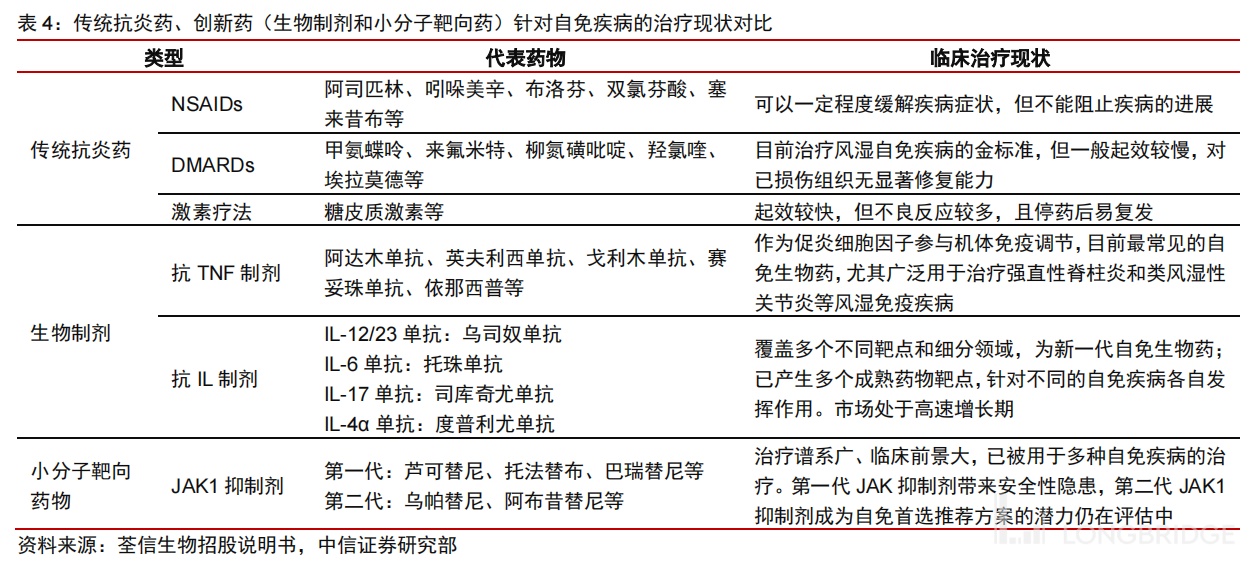 随着医学技术的持续发展,目前自免临床常用的创新药,已经转变为创新靶向制剂(生物制剂和小分子靶向药),也就是抗 TNF(肿瘤坏死因子)制剂、抗 IL(白介素)制剂和 JAK1 抑制剂等。