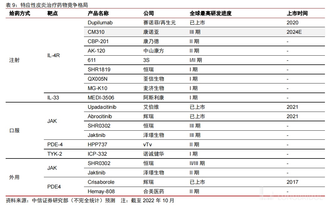 根据 2022 年财报显示,康乃德生物将于 2023 年下半年完成 CBP-201 注射液 36 周的中重度特应性皮炎 2 期维持期试验。根据从 CDE 获得的反馈,公司计划在 2024 年第一季度提交 NDA,以便在 2025 年获批上市。