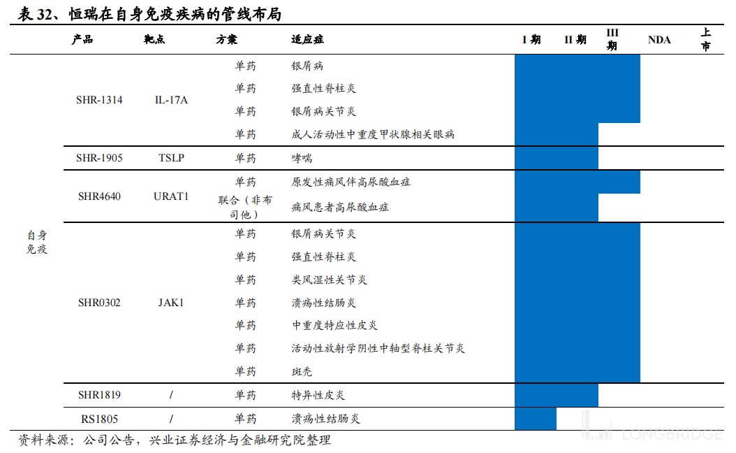 自身免疫病是恒瑞医药重点布局的治疗领域之一,在研管线相当丰富。其中,自研的IL-17A 单抗 SHR-1314已在成人中重度慢性斑块型银屑病、成人强直性脊柱炎Ⅲ期临床研究中证实可缓解疾病进展且安全性耐受性良好。此外,还在成人活动性银屑病关节炎、成人活动性中重度甲状腺相关眼病等多种自身免疫性疾病中开展Ⅱ期临床试验研究,为 SHR-1314 在自身免疫性疾病中的应用提供更为充分的科学依据。