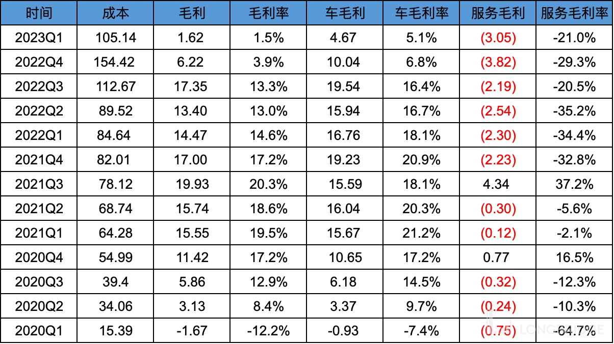 22Q4 毛利率已暴跌到最近几年新低,本季度进一步下跌到 1.5%,车毛利率进一步下跌到 5.1%。由于 4 月和 5 月份的销量比 Q1 还低,且清库存老车型占比仍不小,所以 Q2 毛利率预计还是会保持低位。毛利率的回升至少要到 Q3 看到效果。