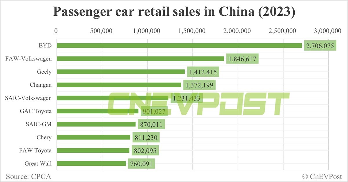 根据中国乘用车协会 (CPCA) 的最新排名,比亚迪 (OTCMKTS:BYDDF) 在 2023 年主导了中国的新能源汽车 (NEV) 市场,而特斯拉 (NASDAQ:TSLA) 排名第二。