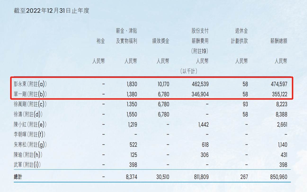 The data for 2022 is equally astonishing, with share-based payment expenses of 463 million yuan, bringing the total compensation to 475 million yuan. From 2022 to 2023, Peng Yongdong's two-year compensation reached 1.188 billion yuan.
