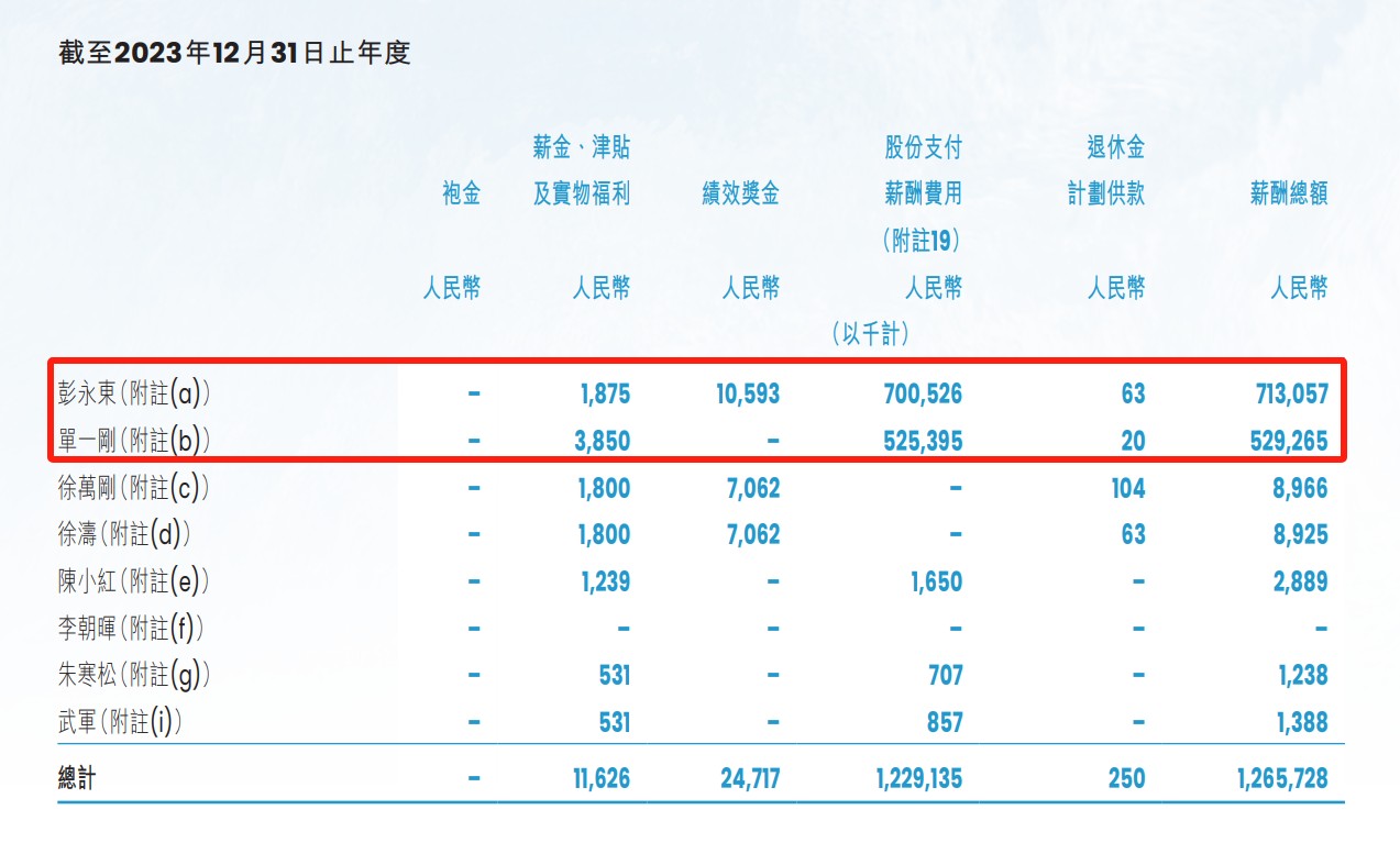 In the annual report, Peng Yongdong's total compensation amounted to 713 million yuan, consisting of four parts: salary and allowances of 1.875 million yuan, performance bonuses of 10.593 million yuan, retirement benefits of 63,000 yuan, and the largest portion being share-based payment expenses, reaching as high as 700 million yuan.