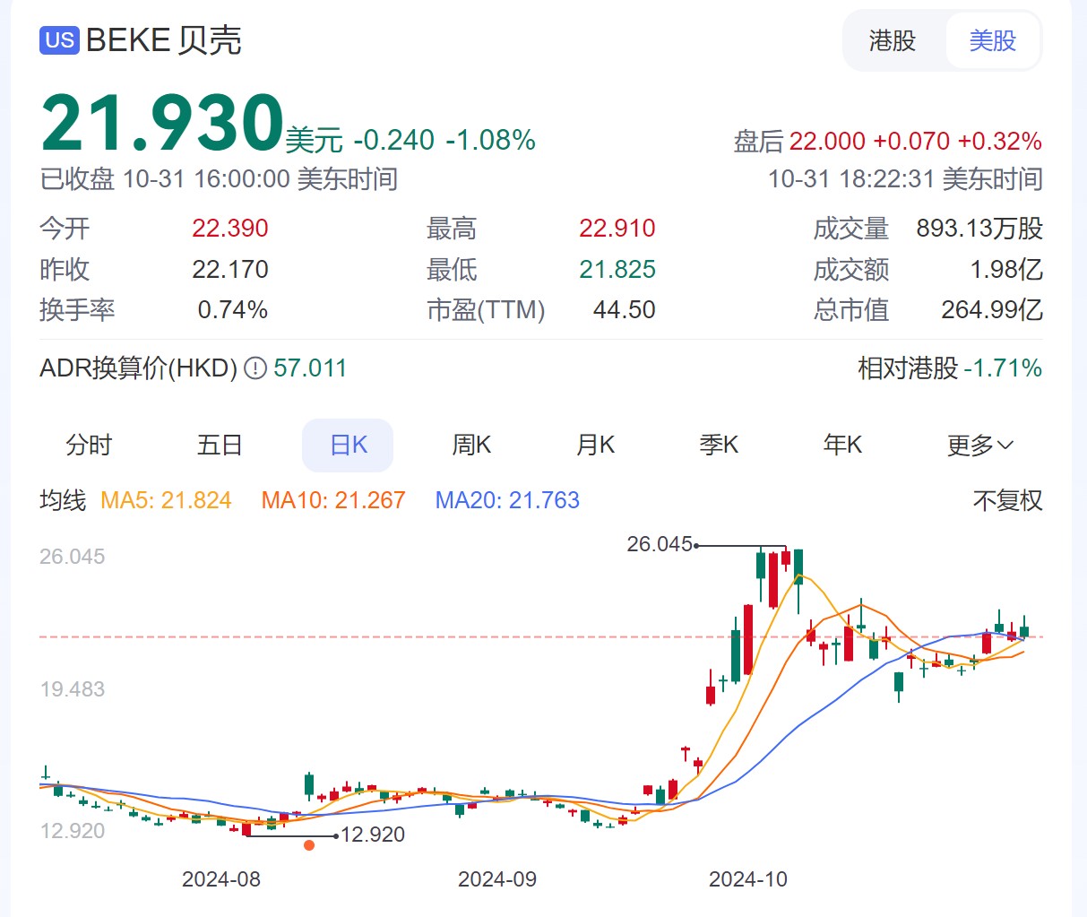 However, under Peng Yongdong's leadership, KE achieved a turnaround in 2023. The annual net revenue reached 77.8 billion yuan, a year-on-year increase of 28.2%, with a net profit attributable to the parent company of 5.89 billion yuan. KE's stock price also showed a stabilizing and rising trend at the beginning of 2024. As of now, KE's U.S. stock is about $22 per share, with a total market value of approximately $26.5 billion.