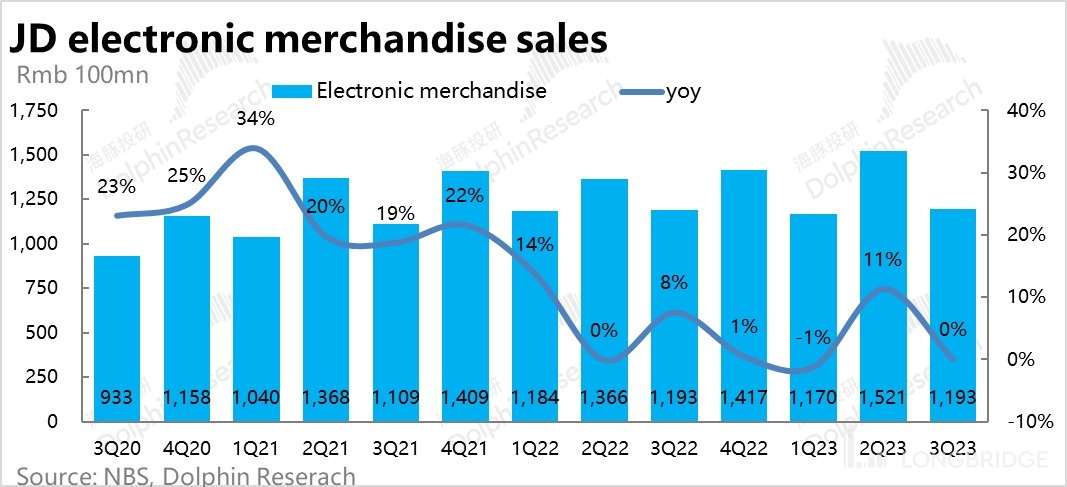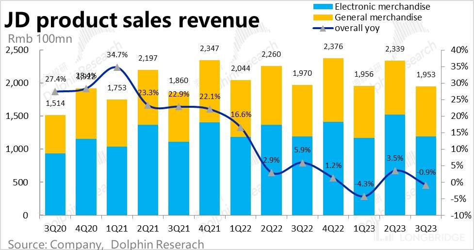 2. 进一步细分来看,通电商品零售、一般商品零售和平台服务&广告收入,三大板块的收入增速都在正负 3% 之间,即基本不增也不减。