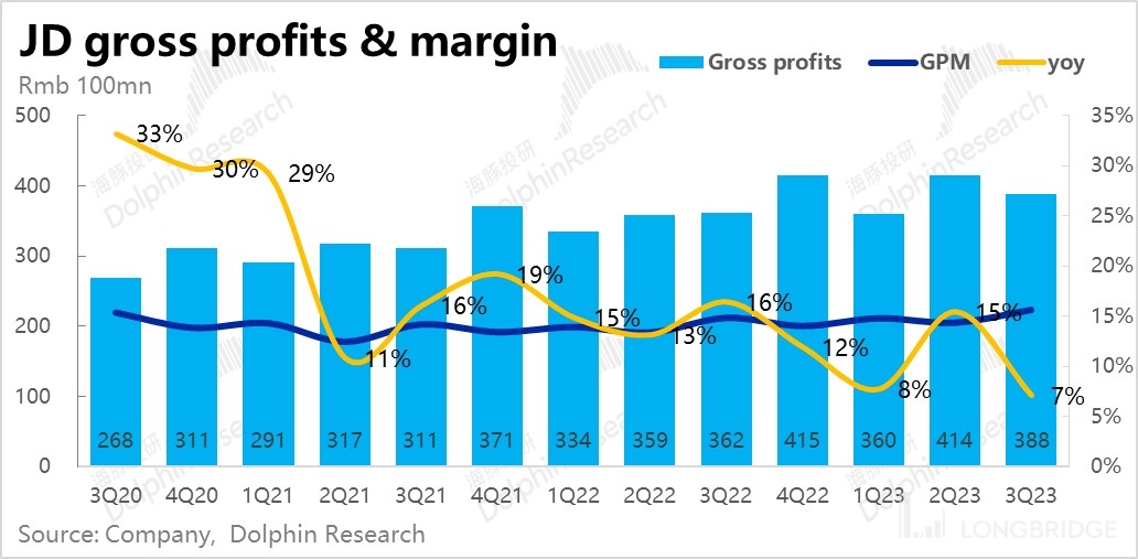 1、首先毛利层面,本季实现毛利润 388 亿,比预期高出约 11 亿,同比增长 7%。同时毛利率也同比提高了约 0.8pct 到 15.6%。一方面,趋势上毛利提升还是因为非自营零售外的高毛利收入占比提升导致,另一方面也显示京东在商品价格上的补贴并没明显影响毛利。
