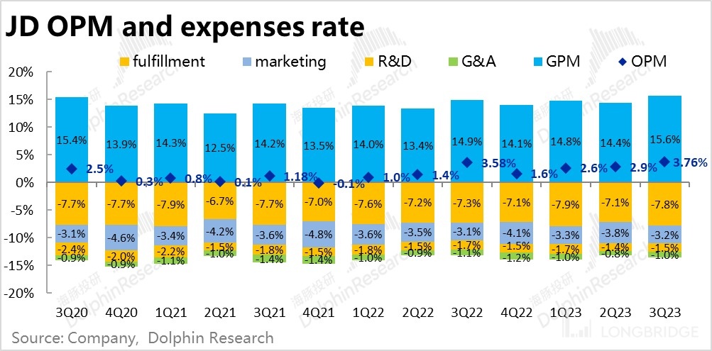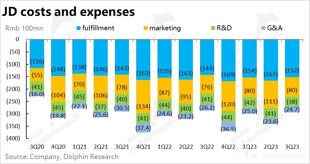 4. 成本和费用上,本季实现毛利润 388 亿,比预期高出约 11 亿,同比增长 7%。毛利率也同比提高了约 0.8pct 到 15.6%。一方面,毛利率上升还是因为 3P 业务占比提高,另一方面也显示京东对商品的补贴并未影响利润。