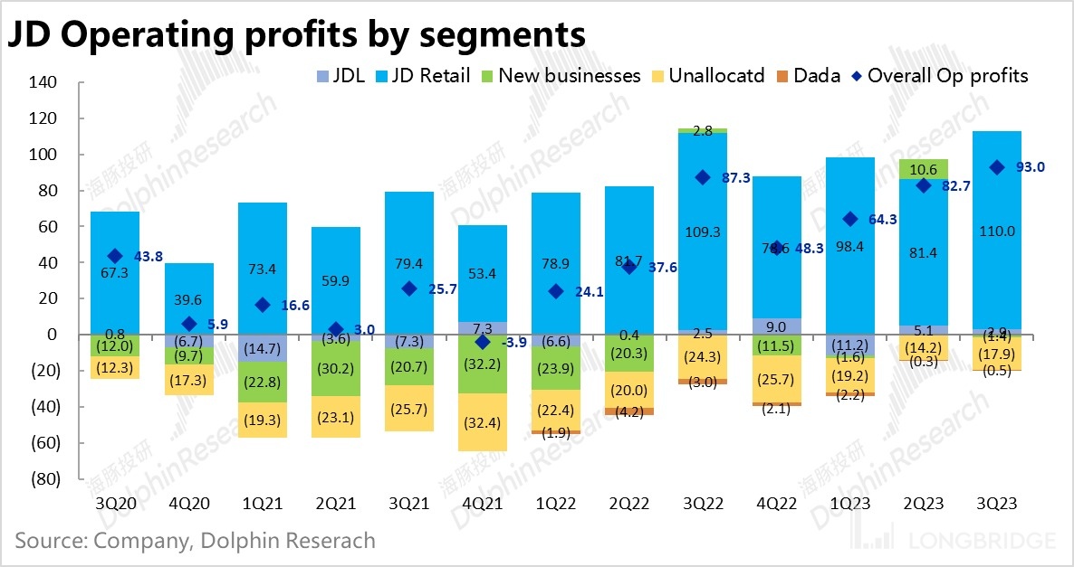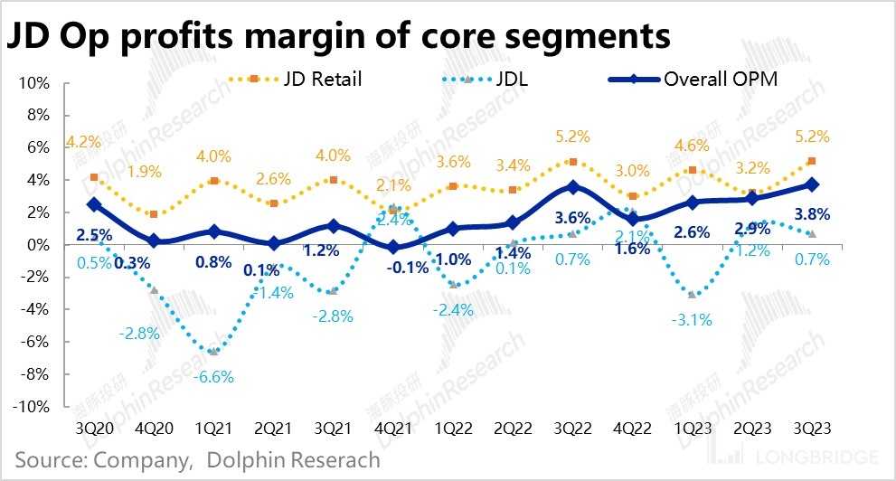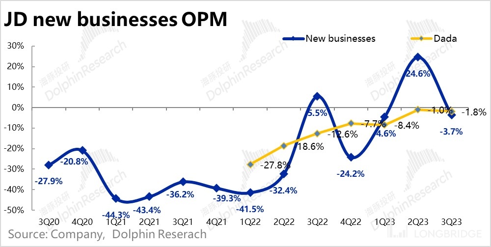 3)而包括京喜、海外电商在内新业务本季收入为 38 亿,环比继续萎缩,可见京东仍在收缩非核心业务;