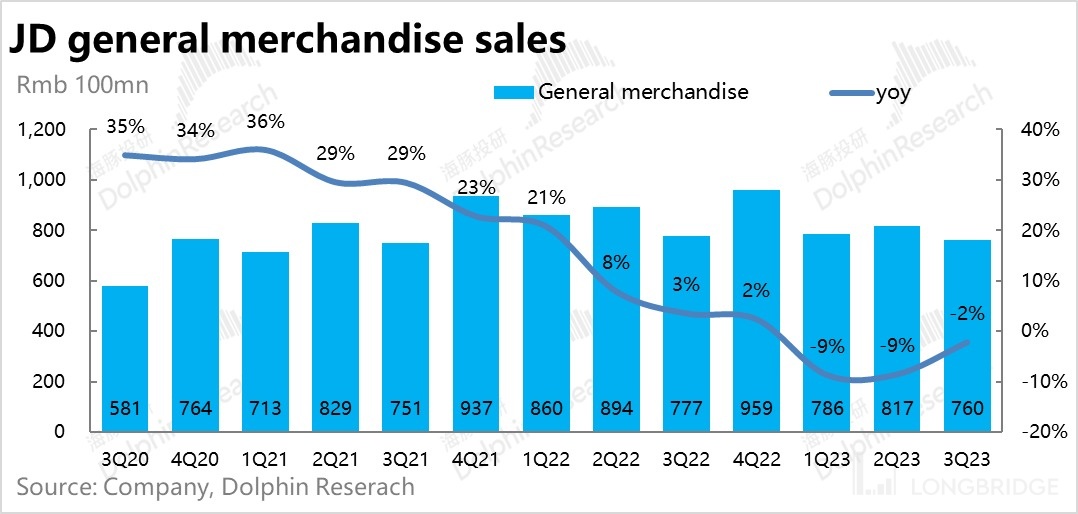 而继续受经营模式由 1P 变为 3P 影响的一般商品零售,本季度实现收入 817 亿元,同比下降 2 %,虽然仍在萎缩,但同比下降幅度已开始收窄,也比市场预期要高约 4%。这或许暗示着模式变更的影响可能将要结束。