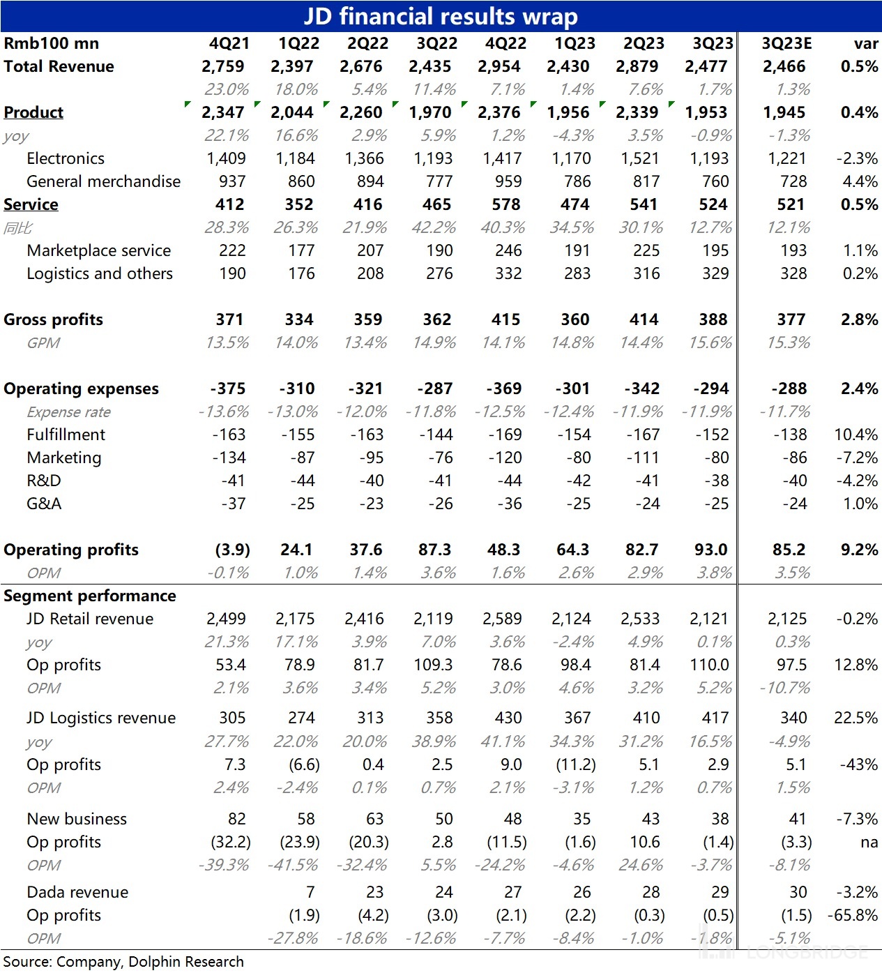 11 月 15 日晚美股盘前,京东(JD.US)公布了 2023 年三季度财报,概括来看收入增长几乎停滞,表现虽差但已充分预期,但利润释放小超预期则会让投资者略感欣慰,要点如下: