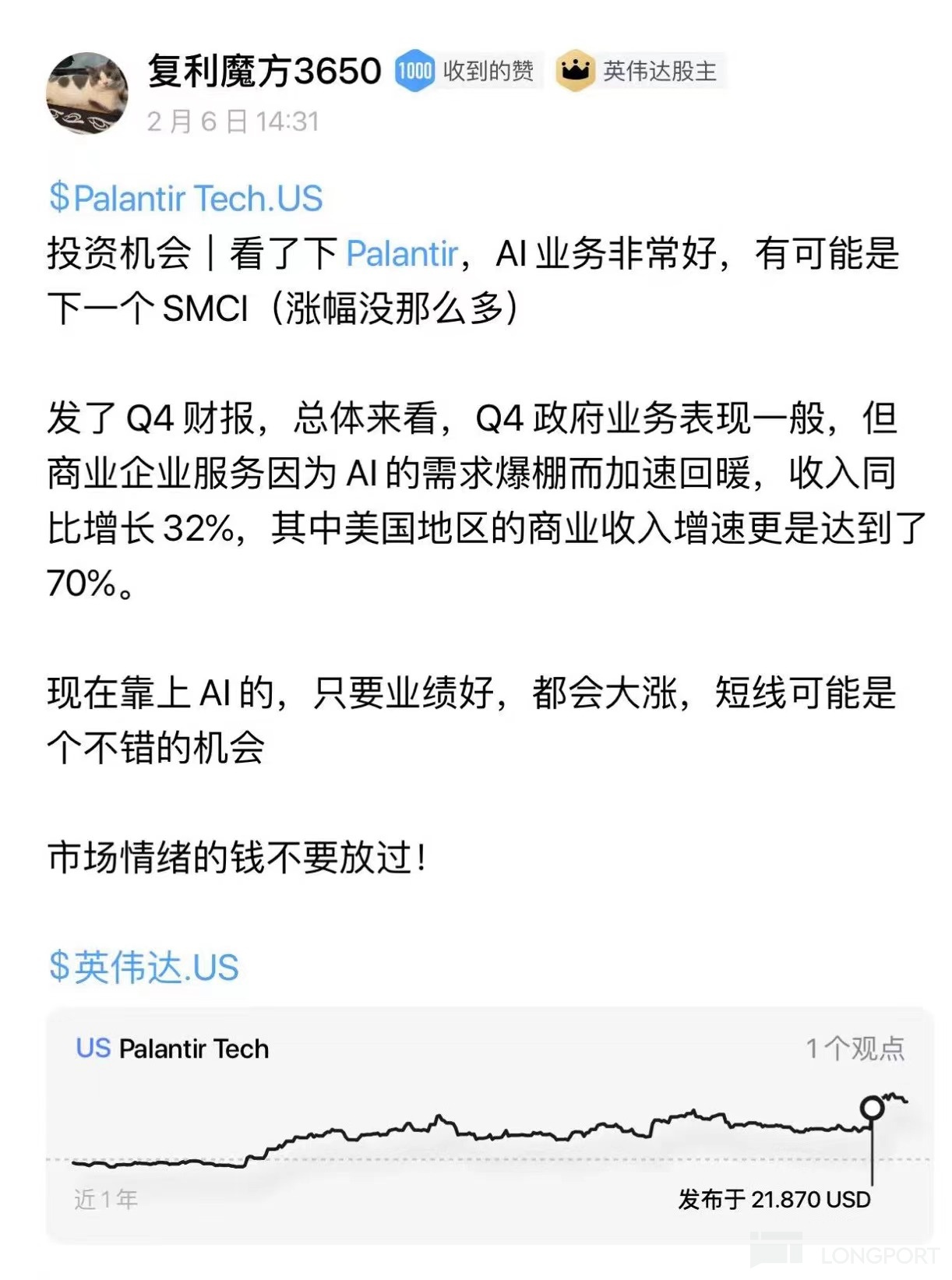 SMCI 新年涨了几倍,ARM 几天翻倍,PLTR 财报后继续大涨,除了基本面带动,情绪面不可忽略,英伟达也是如此。