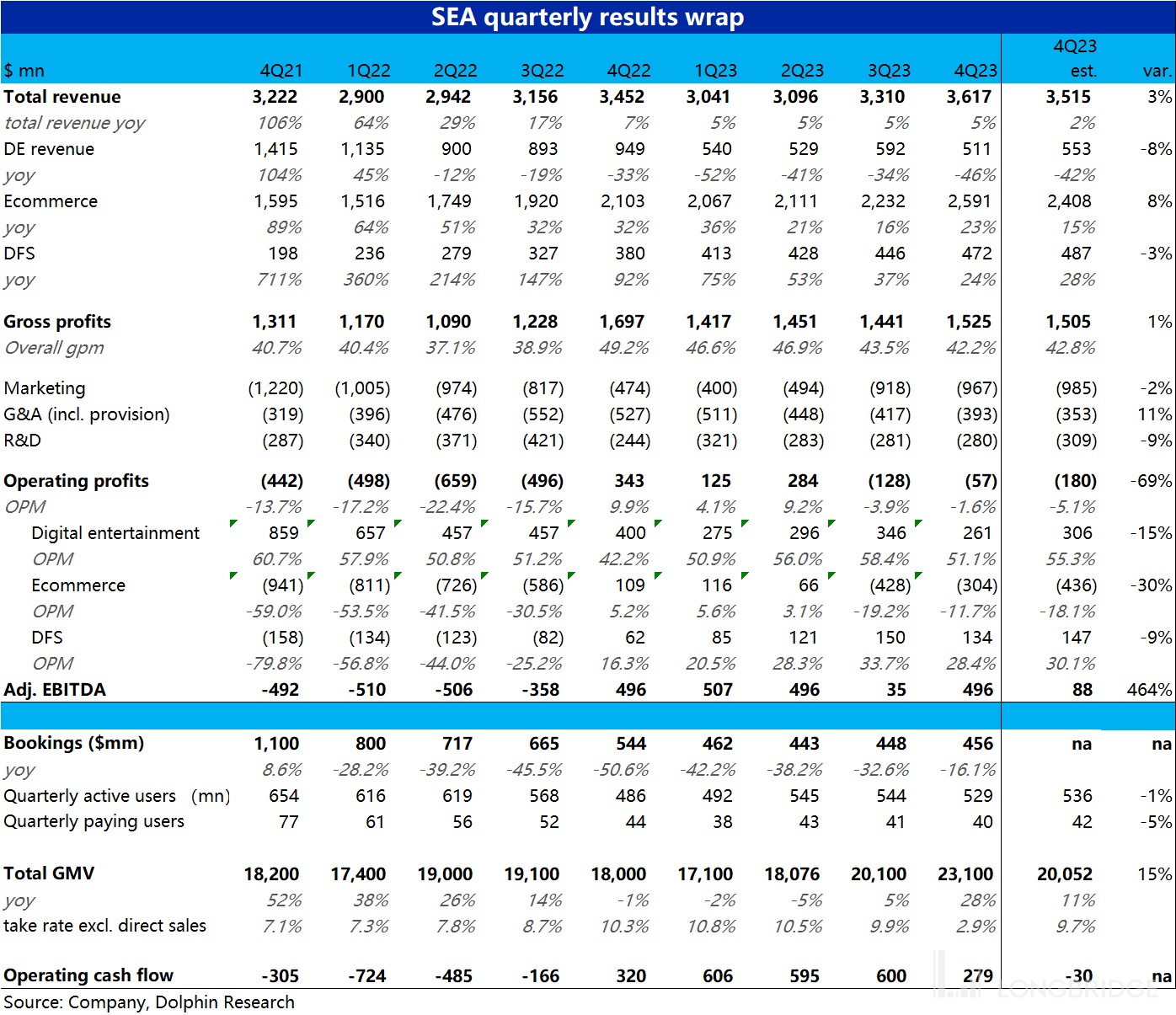 以下是 sea 2023 年四季度的财报电话会纪要,财报解读请移步《Tiktok 缺席送反转,SEA 的春天要来了?》