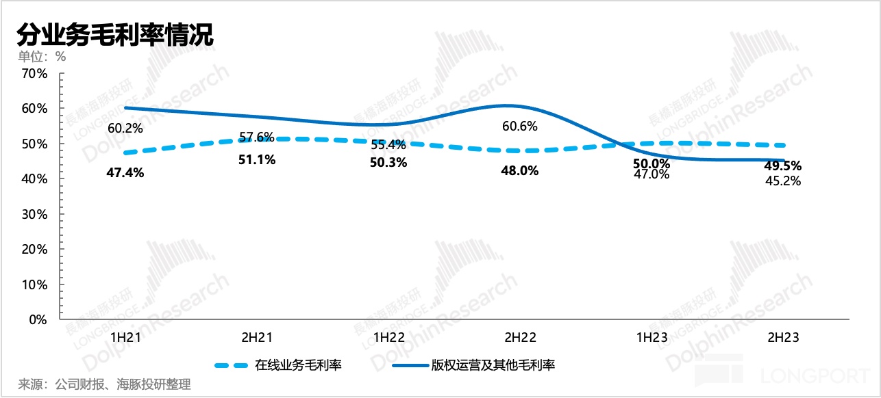 不过下半年与市场预期有偏差的,主要体现在版权收入的毛利率上,下半年版权业务毛利率下滑至 45%,市场预期普遍在 50% 以上。在线阅读业务毛利率勉强保持稳定,通过涨价策略抵消了高毛利的分销收入、免费阅读的广告收入下滑对整体毛利率的影响。