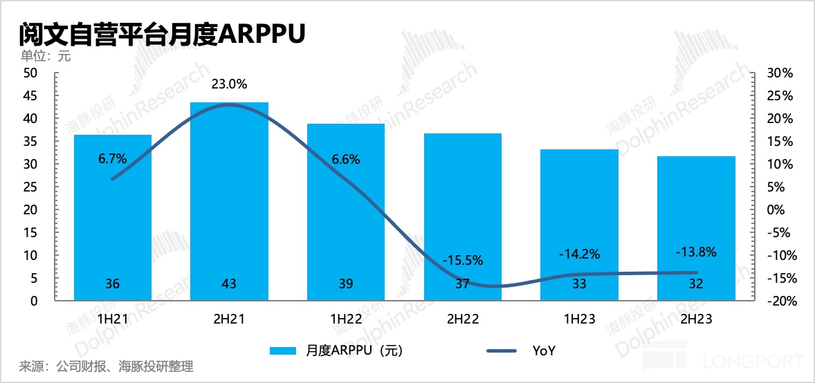但因为新用户付费偏弱,拉低了平均付费金额 ARPPU,最终体现在整体网文收入仍然在同比下滑中,只是下滑幅度环比上半年有所放缓,2023 年下半年在线业务收入 19 亿,同比下滑 7%,略低于头部投行的预期 19.6 亿。在低基数下,下滑幅度才有所放缓。