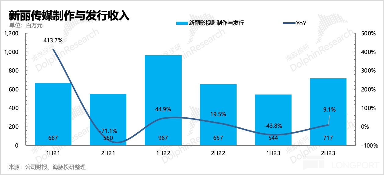 去年上半年,新丽因为 22 年《你好李焕英》的高基数,以及疫情封控期间拍摄进度影响而导致剧荒,因此同比下滑惨烈。但下半年在并不算很低的基数下,靠着几部精品剧仍然维持了 9% 的增长。