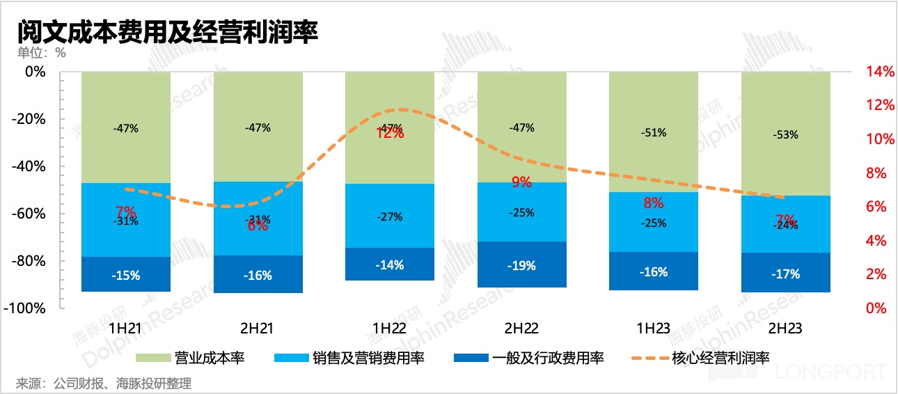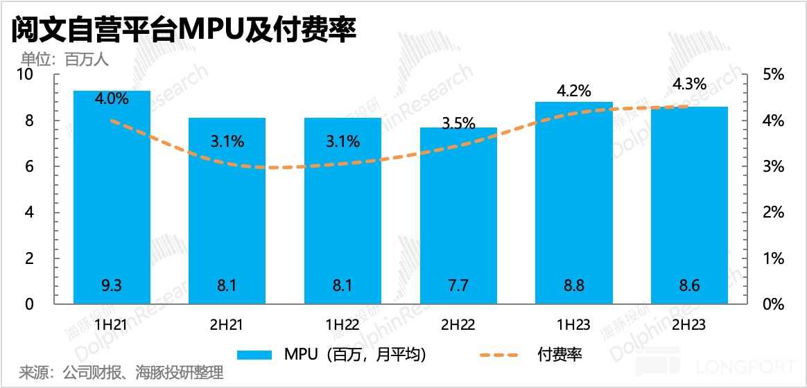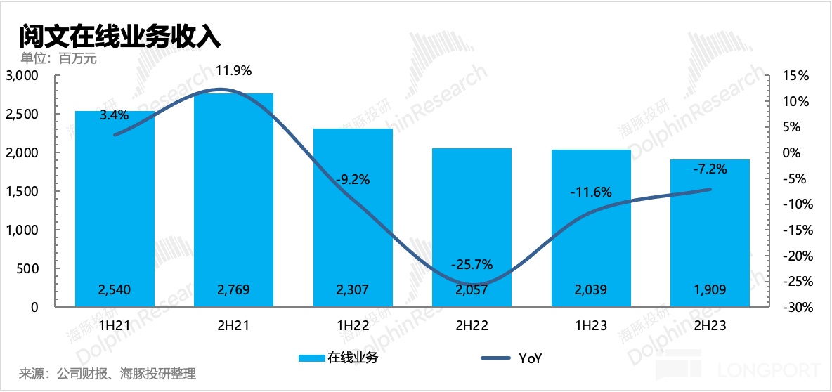 但因为新用户付费偏弱,最终体现在整体网文收入仍然在同比下滑中,只是环比上半年有所放缓,2023 年下半年在线业务收入 19 亿,同比下滑 7%,略低于头部投行的预期 19.6 亿。