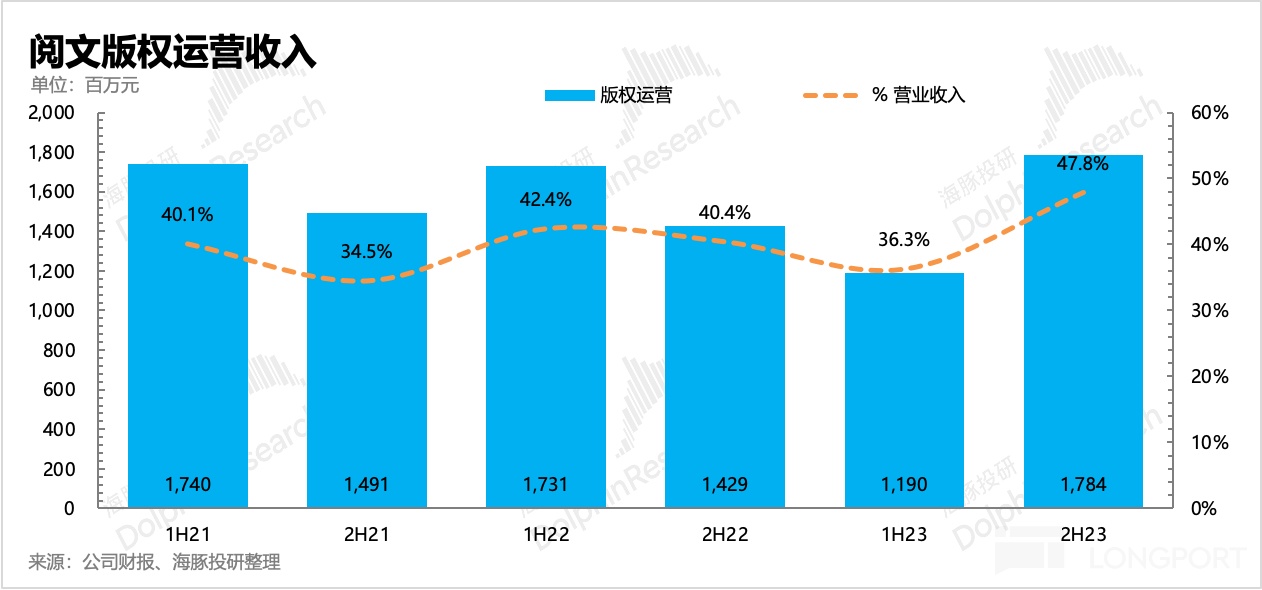 收入端则是无惊无喜,基本符合预期,网文部分依旧在阵痛期,但版权运营收入同比增长 25%,其中非新丽传媒部分更亮眼,同比增长 38%,海豚君认为,或许和游戏、短剧相关的 IP 授权以及流水分成关系较大。