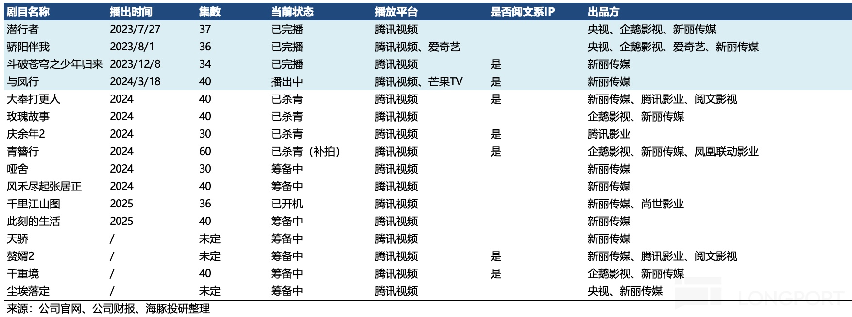 而海豚君预计,今年新丽依旧能打,春节期间一部《热辣滚烫》开了个好头,去年下半年未播的古装剧《与凤行》今天开始播出,与此同时,还有 4-5 部精品剧待播,此外一再延期的《庆余年》、《赘婿》以及问题剧《青簪行》也在积极制作和补拍,不排除今年安排档期上映。