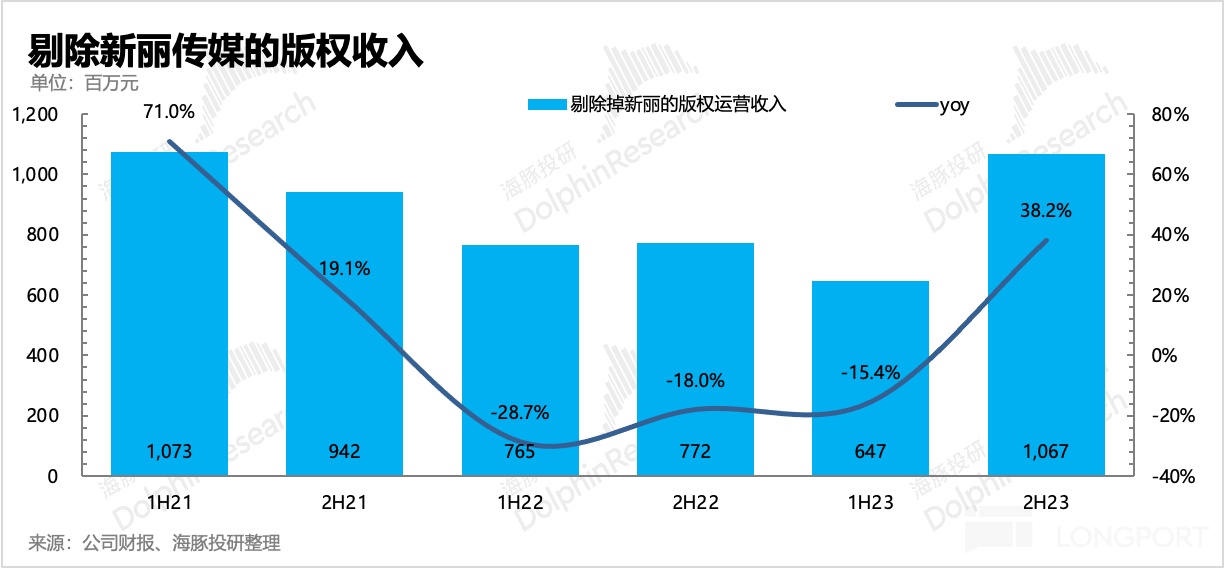 但在此期间,擅作精品的新丽传媒不乏有爆款剧、影片上映,因此勉强撑住版权部分收入。不过 23 年下半年一个好的迹象是,在剔除新丽收入之外,剩下的 IP 授权、游戏自营等业务收入,同比增长 38%。