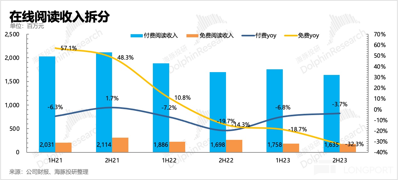 海豚君对在线业务进行了付费和免费两部分的拆分,其中免费阅读收入(广告)下滑 32%,除了竞争之外,也有公司自身战略调整的影响。付费收入下滑 3.7%,看似稳定,但考虑有低基数推动,以及 2022 年底涨价的情况,付费部分收入的表现也不好。因此整体上,网文基本回避不了行业颓态的大趋势。
