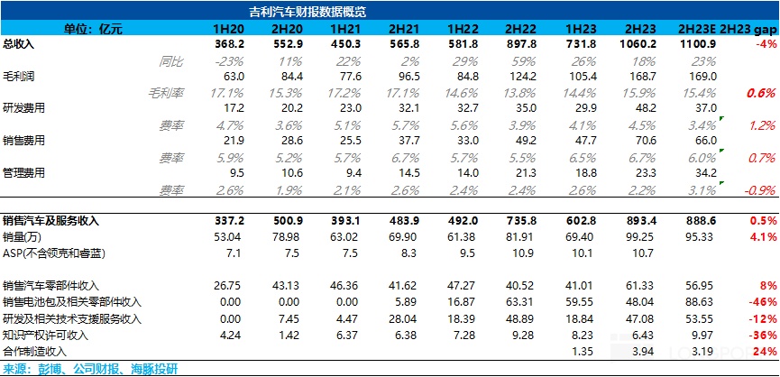 2、销量价格双提升带来汽车销售业务收入超预期:在高端车极氪车型放量,以及吉利系列单价更高的银河热销对 ASP 提振作用下,单车 ASP(不含领克和睿蓝)环比上升 0.6 万元,在销量已知的情况下带动汽车销售收入超预期。
