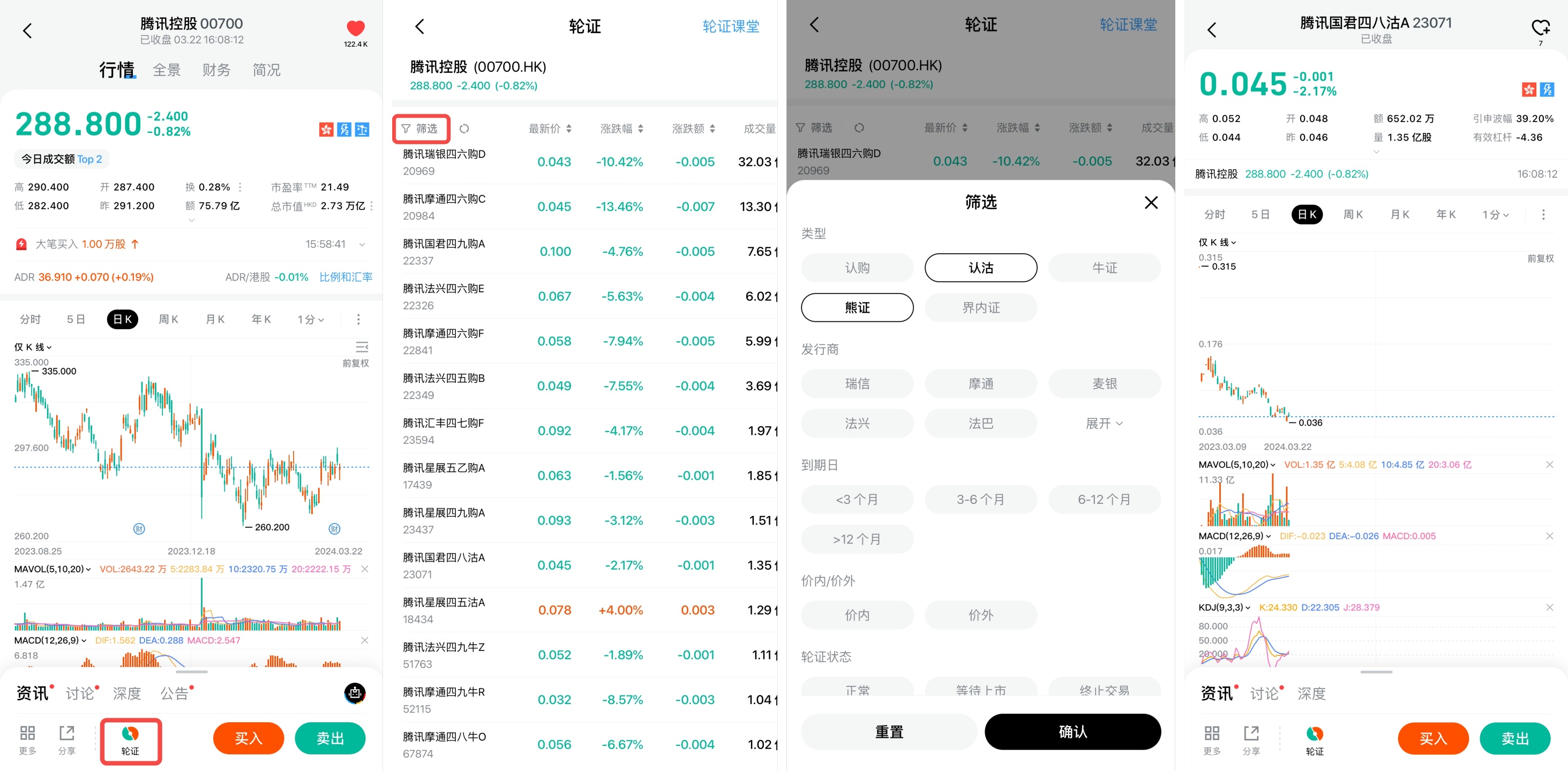 - 进入港股个股详情页,点击左下方 “轮证” 按钮,进入轮证页面;