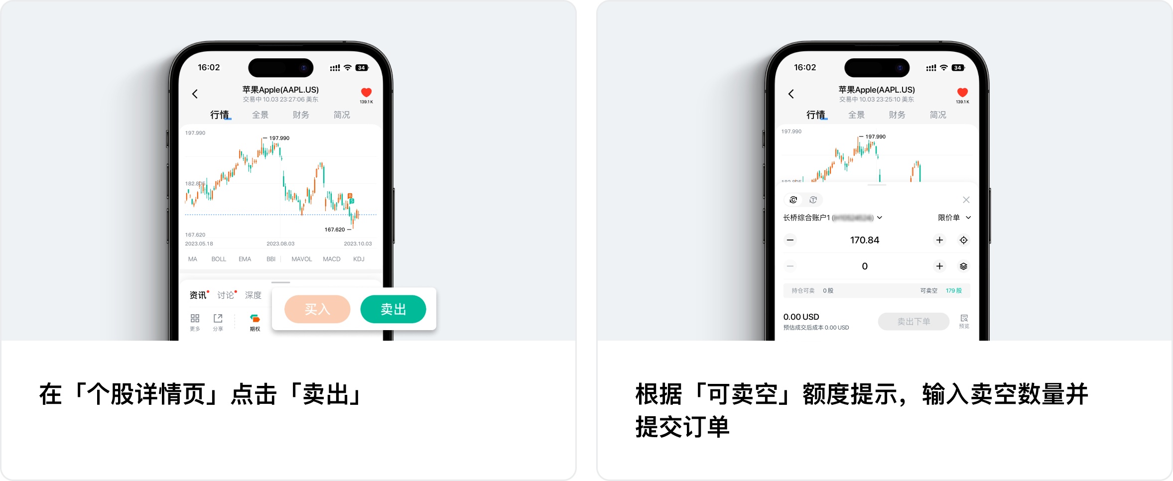 大家熟知的做多获利,指的是 “先买后卖、低买高卖”,卖空正好相反,是 “先卖后买、高卖低买”。当您预期某股票未来将会下跌时,您可以向长桥借入该股票并卖出,待该股价下跌时低价买进同等数量该股票,从中赚取差价获利。