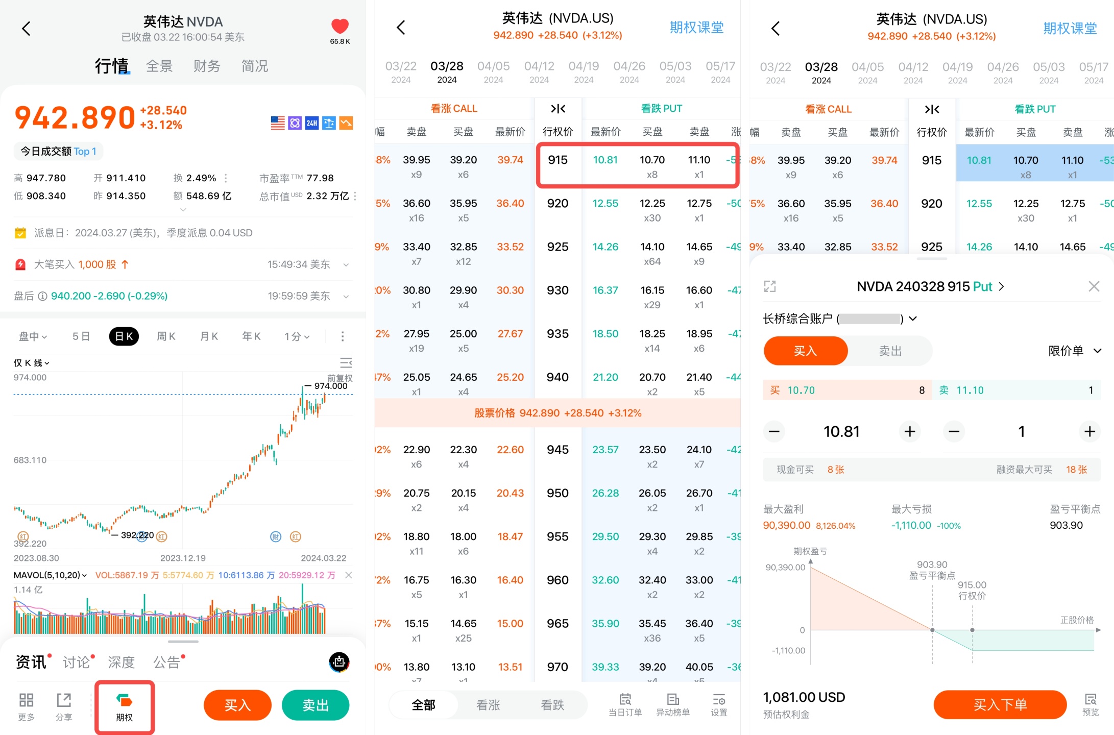 - 进入美股个股详情页,点击左下方 “期权” 按钮,进入期权链页面;