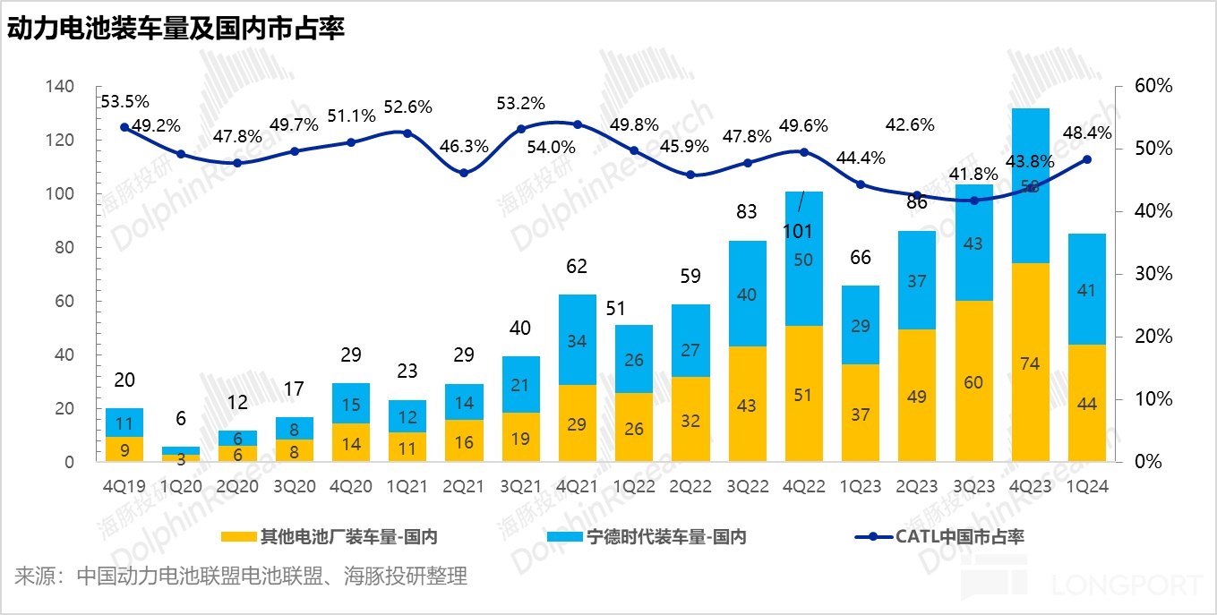 一季度,受春节假期以及新车空窗期影响,新能源汽车销量和动力电池装车量均环比回落均在 35% 左右,但宁王在保持单价稳定,并未主动降价的情况下市占率仍然有所回升,从去年四季度 43.8% 增长 4.7% 至今年一季度 48.4%。