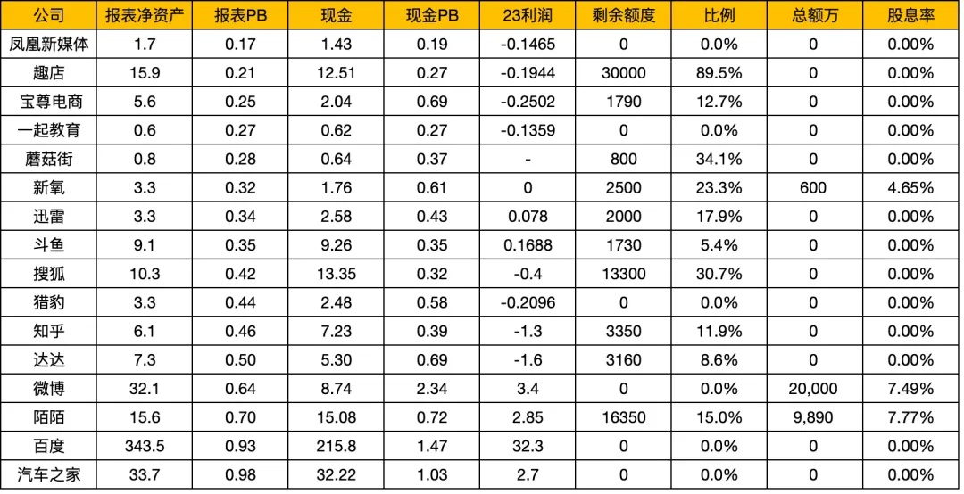 轻资产媒体公司,报表十分干净,固定资产和无形资产金额非常小,PB 低于 0.2,水分不大,近几年一直在亏损,但亏损额度不大,按 23 年亏损 1465 万美金来算,连亏三年后的现金 PB 大约为 0.28,依然具有比较大的安全边际。唯一遗憾的是没有分红和回购,具备投资价值。