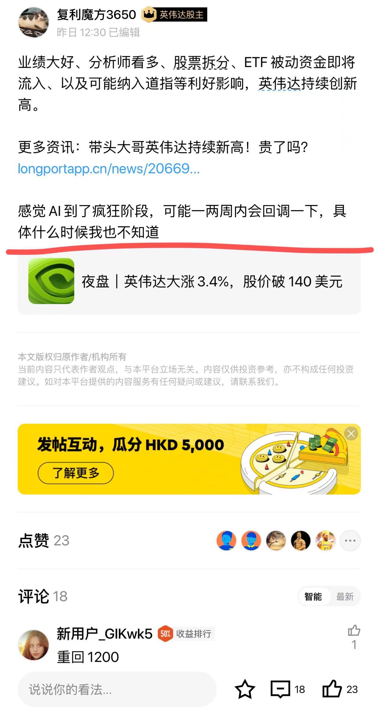 昨天早上,看到$英伟达(NVDA.US) 夜盘又大涨了,感到有点疯狂,