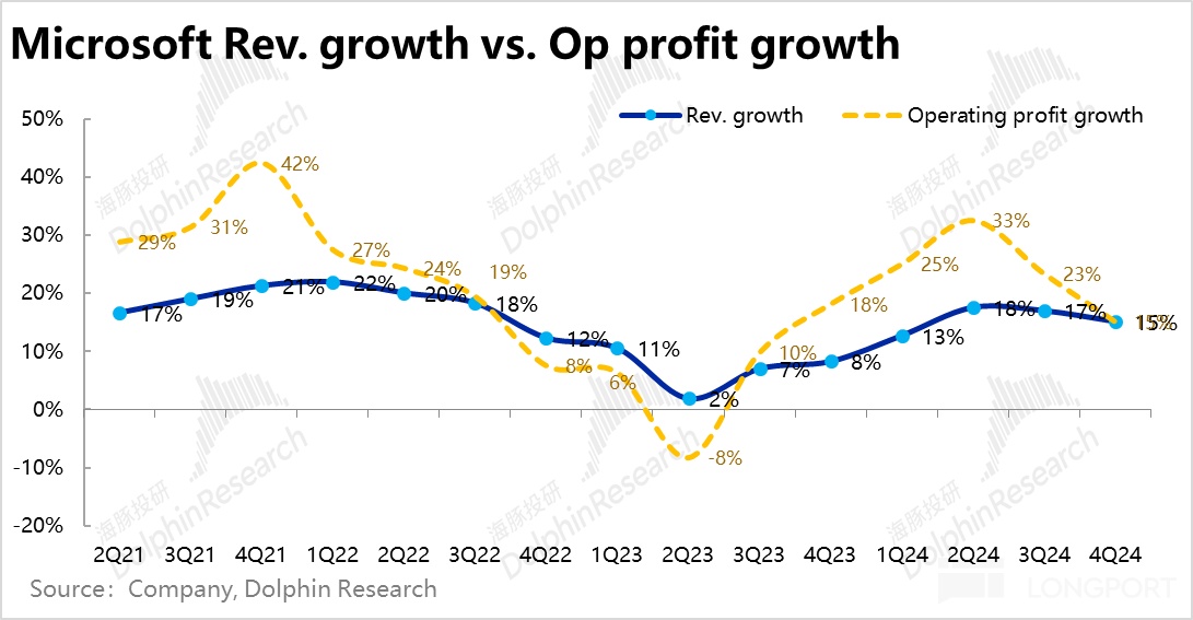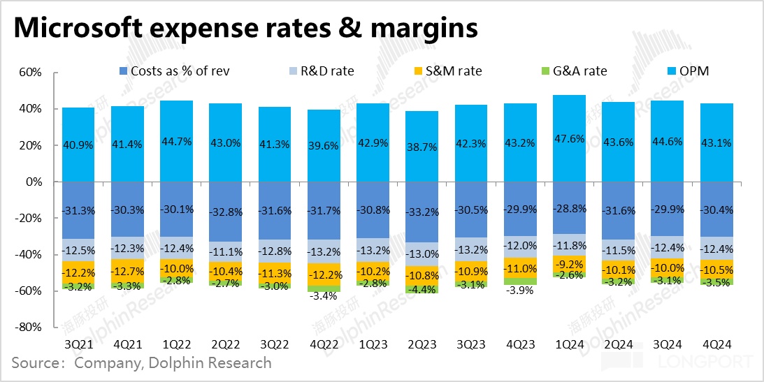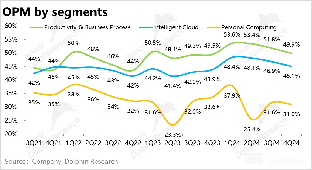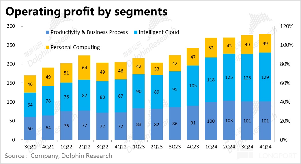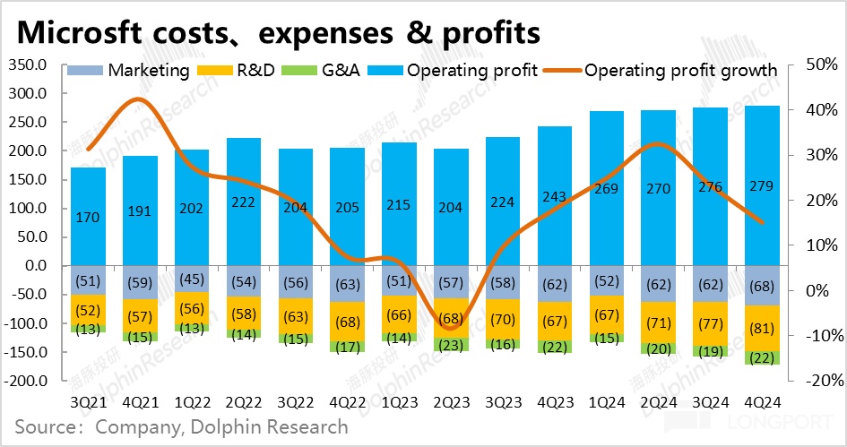 4)整体上,因研发费用和成本的增长高过营销和管理费用的节俭,本季公司的经营利润率是同比下降了 0.1pct 到 43.1%,是24 财年以来内首次利润率同比下降。经营利润同比增长 15%,较前两个季度明显放缓,且已和收入增速完全同频。表明因投入的增加,微软自 3Q23 以来利润增长高于营收的利润改善周期可能将告终。