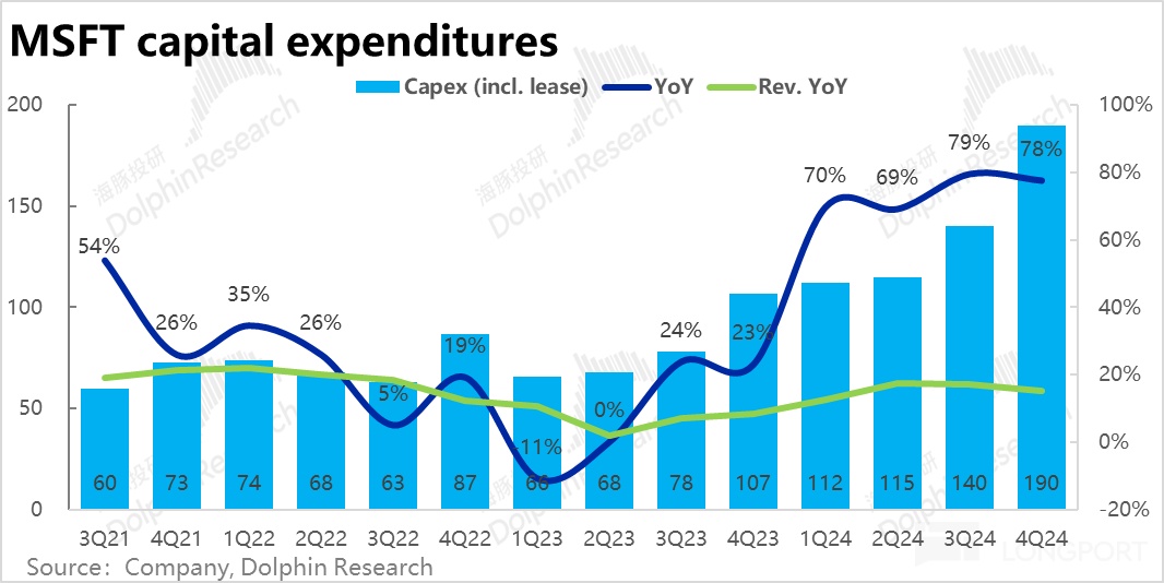 5)本季度微软的Capex 支出则是环比增长 36%,大幅拉升到了$190 亿。即便假设后续季度不再环比增长,那么年华化的 Capex 投入也相当于 23 财年的 2.4x。而 760 亿的年化投入亿相当于近 70%~80% 的 25 年预期经营利润。巨大的投入,势必对盈利会产生无法忽视的压力。